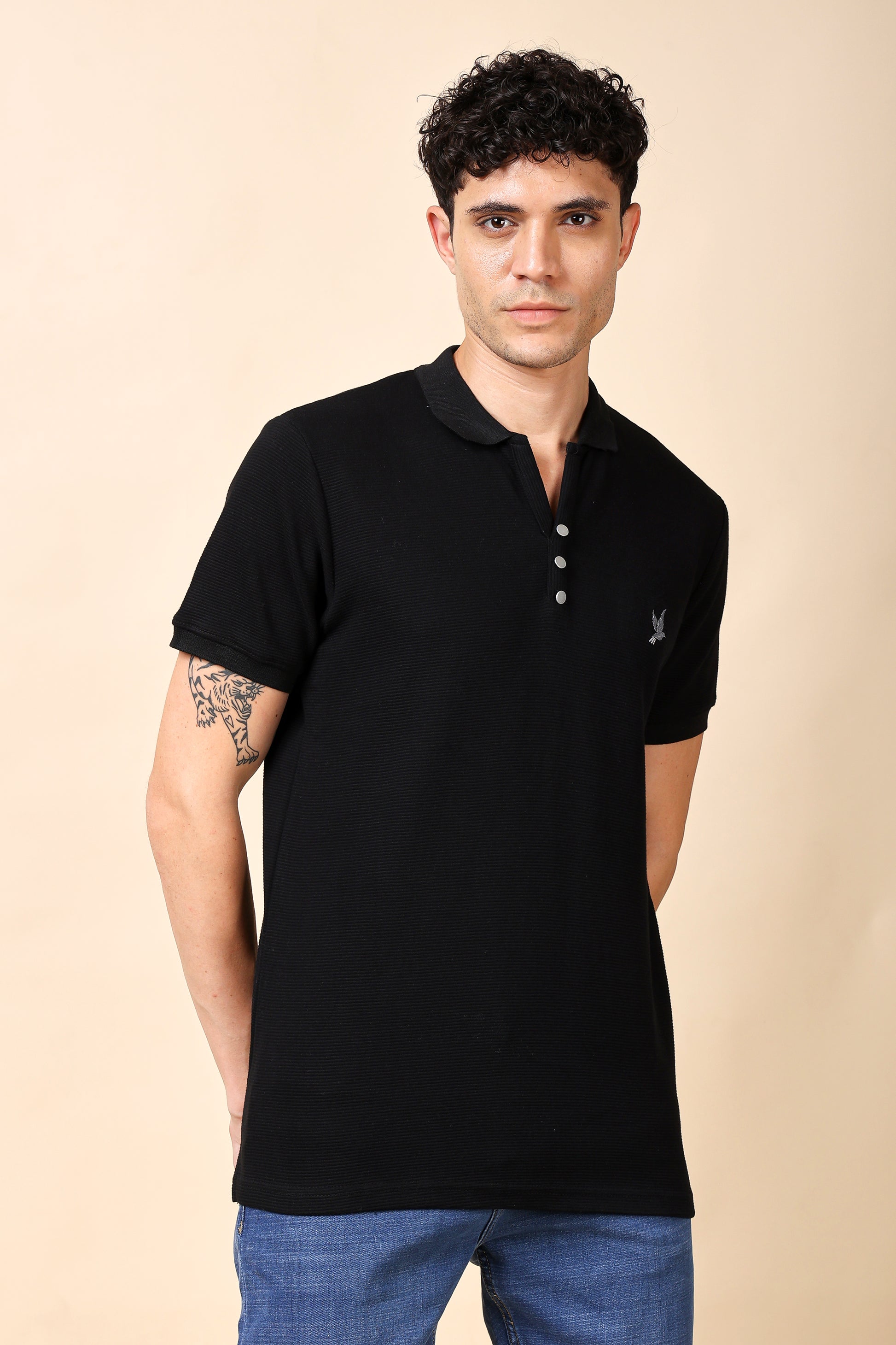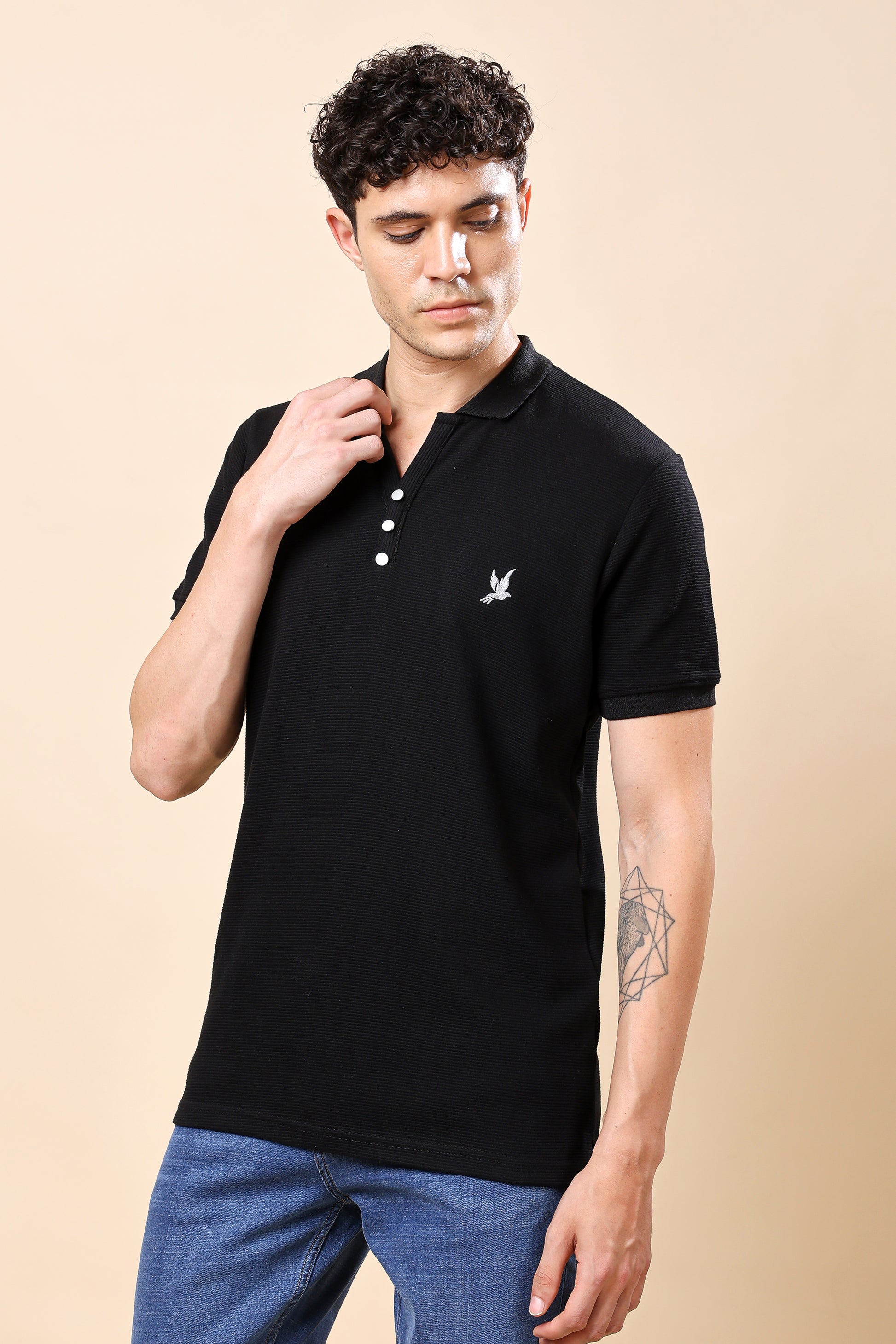 Keep it sharp and versatile with this classic black polo shirt, a wardrobe essential that never goes out of style. Designed with a crisp three-button placket, ribbed collar, and subtle embroidered eagle logo, it strikes the perfect balance between casual comfort and polished sophistication.