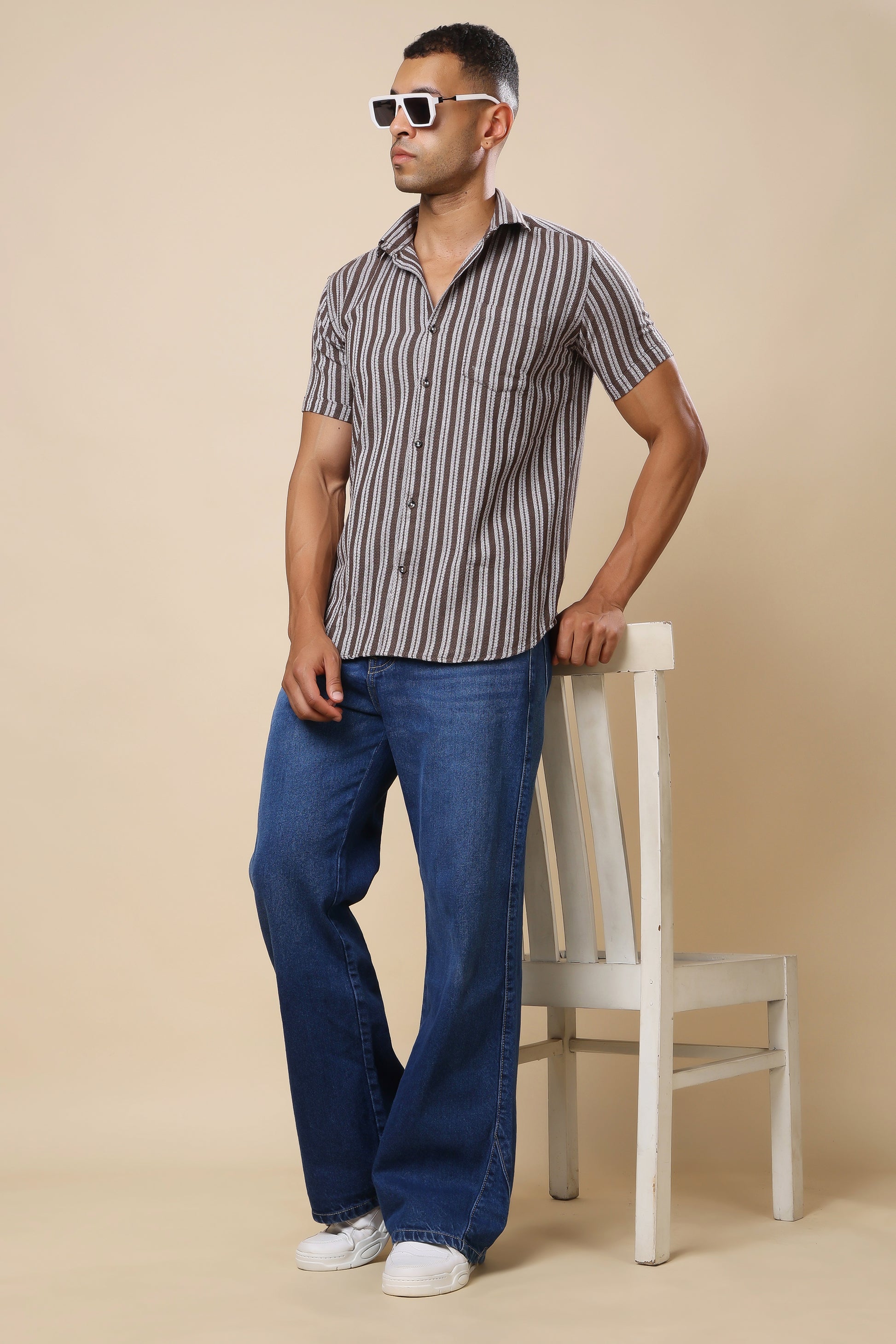 Step up your casual style with this brown striped short-sleeve shirt, crafted for comfort and versatility. The soft cotton-blend fabric ensures breathability, while the vertical stripes add a modern, slimming effect.